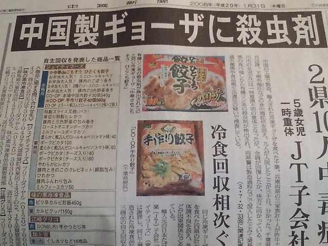 Re:中国製ギョウザに殺虫剤 By 98@名古屋