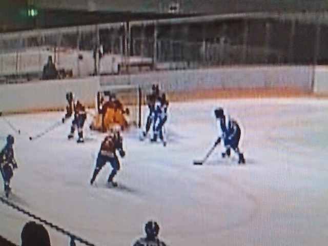 試合は3ピリ 6:45 に動きます。アウルズDF松田の打ったパスのようなシュートのようなパックを