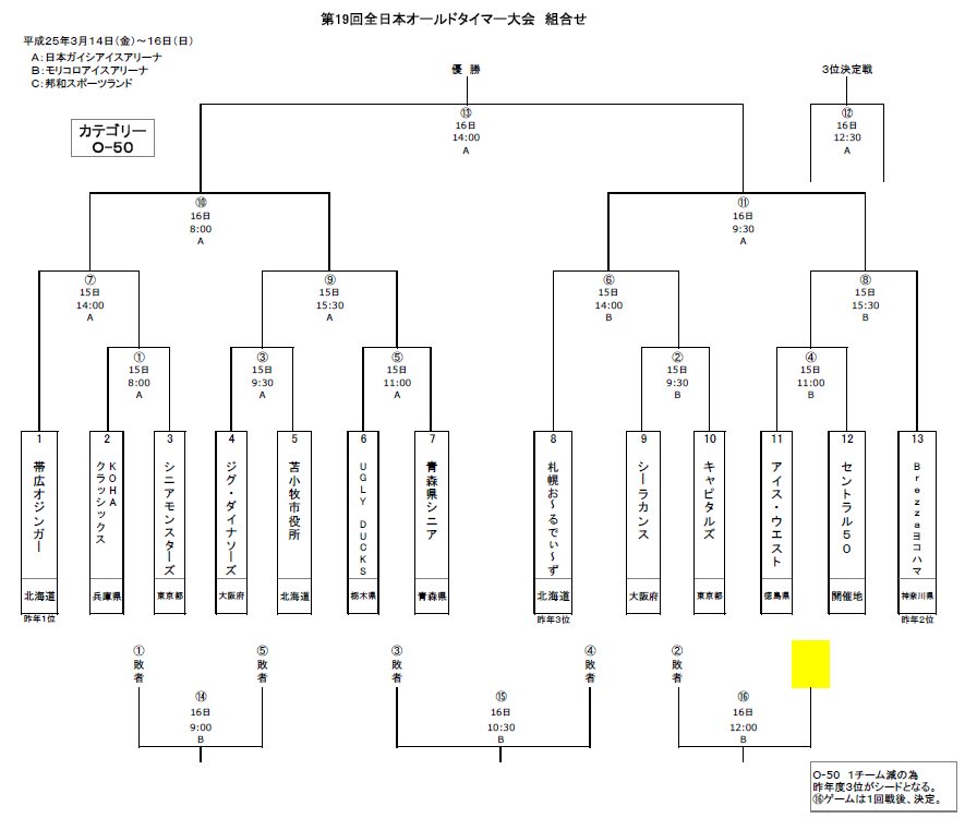 第19回全日本オールドタイマー大会O-50、第2回全日本オールドタイマー大会O-60が3月14日~16日まで愛知県名古屋市、長久手市(日本ガイシアイスアリーナ、モリコロアイスアリーナ、邦和スポーツランド)で開催された。試合結果は以下の通り。