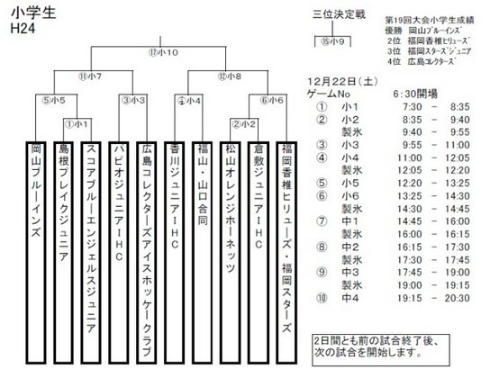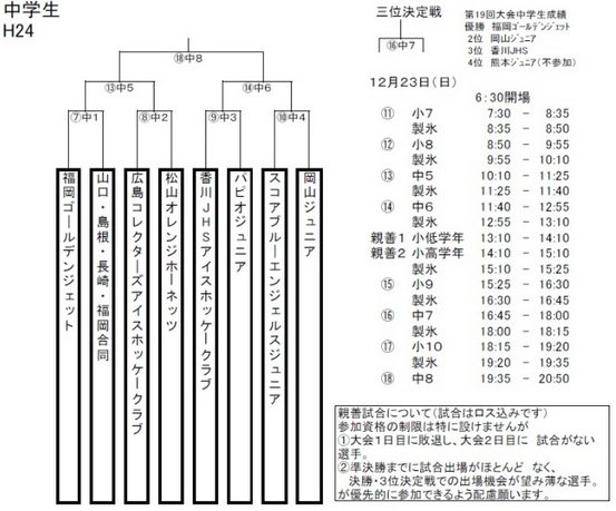 第20回中四国九州ジュニアアイスホッケー広島大会の組み合わせです。