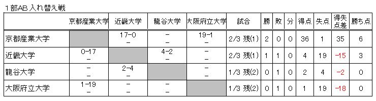 11/09 15:15 [関大] 1A5位 京都産業大学 19-1 1B2位 大阪府立大学